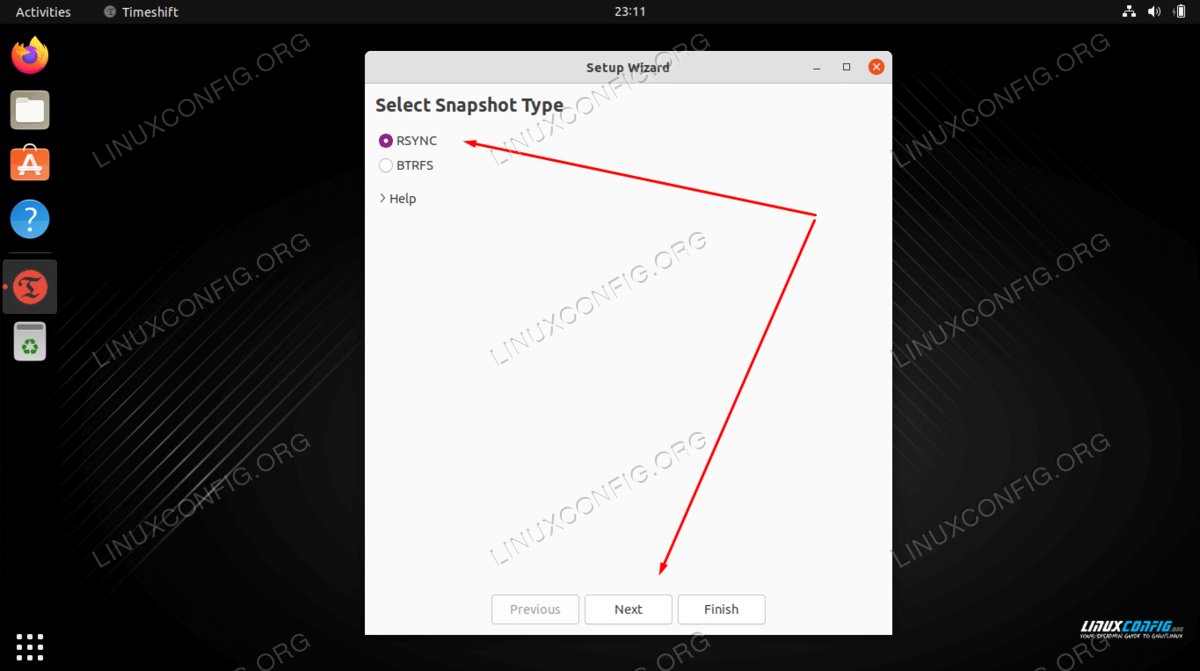通过左上角的Activities 菜单打开timeshift 应用程序。打开timeshift应用程序后,您将看到一个向导来帮助您安排备份。这里你有两个选择。首先是使用 rsync 协议作为主要备份工具或利用固有的 BRTFS 内置文件系统功能。在此示例中,我们将使用 rsync。选择RSYNC并点击Next按钮。