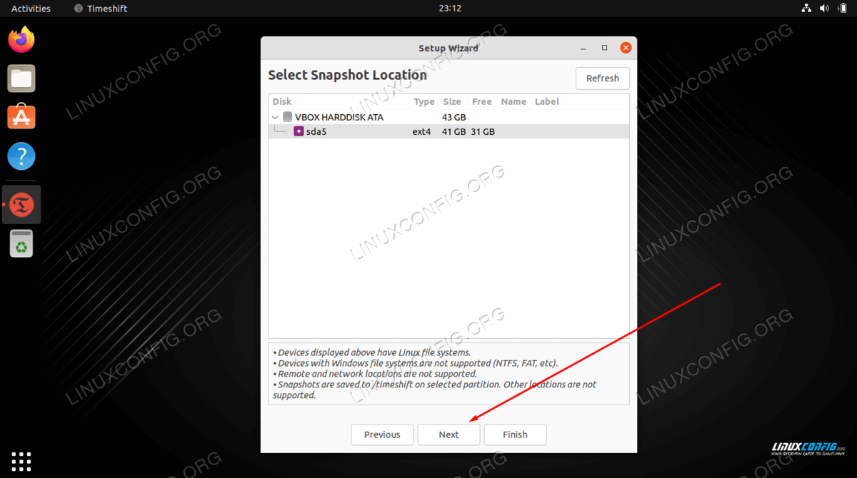 选择备份目的地。 timeshift 将在您的系统中搜索可用的文件系统分区,并为您提供在何处创建备份文件的选项。
