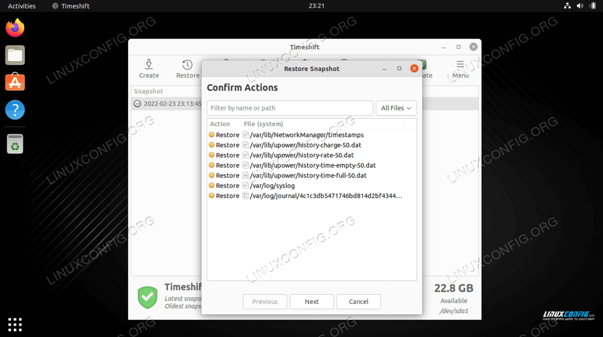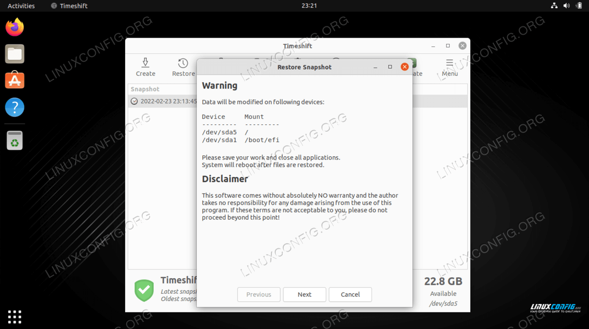 $ sudo timeshift --restore --snapshot "2022-02-23_18-32-36"