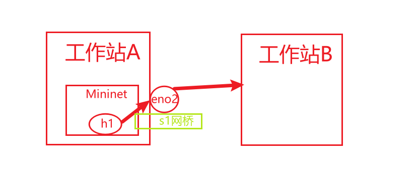 原理:将宿主机的任意网卡桥接到Mininet下的s1网桥里(此处使用在用网卡eno2)。host设置与工作站B同一的网段。
