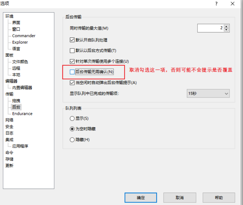 WinSCP在使用后台传输这一功能时,不会在覆盖文件前提示,需要进行设置