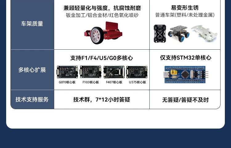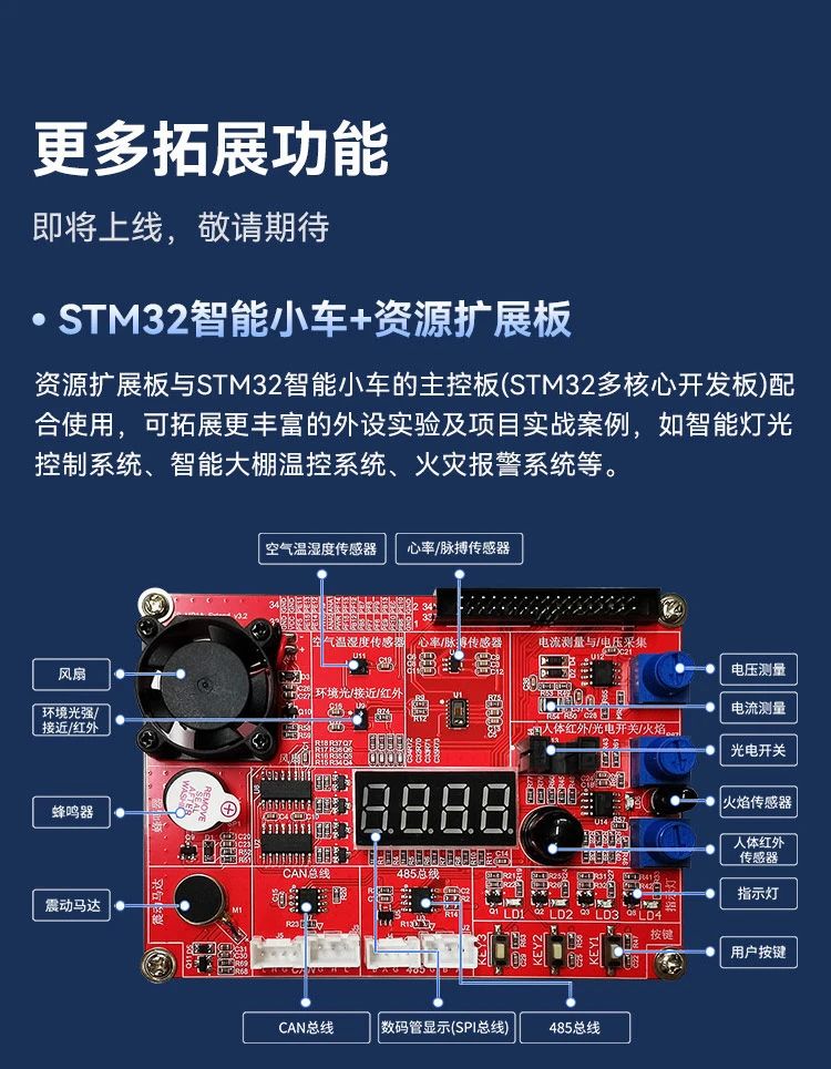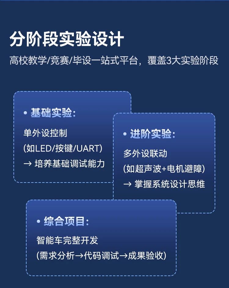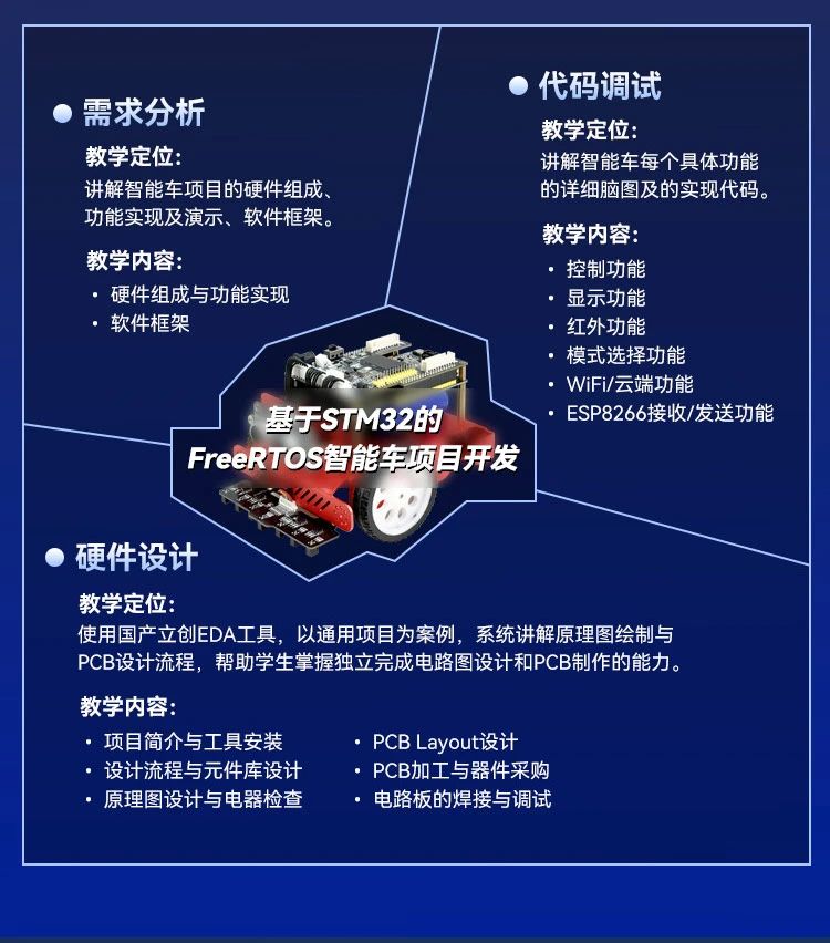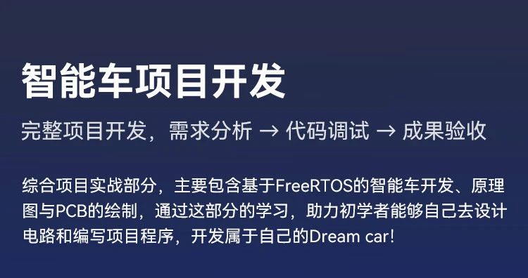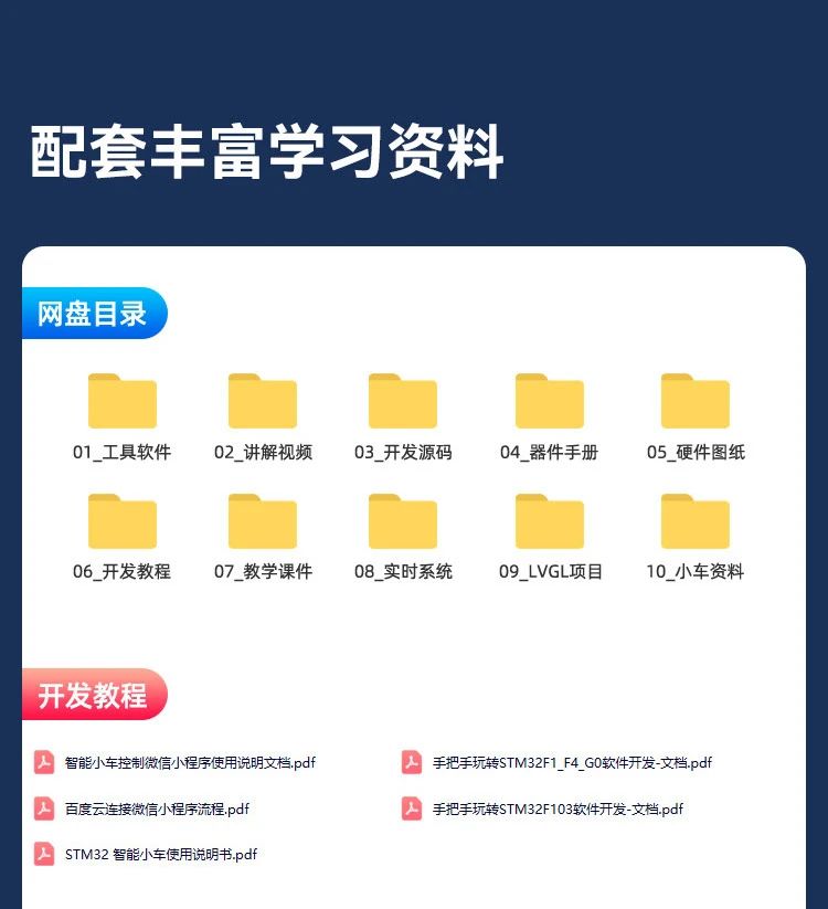 作为一款面向学习与开发的小车平台,STM32F103智能云控小车另一大特色是配备了体系化的软硬件学习课程。课程内容覆盖广泛,包含三大阶段、六大课程,近400讲视频教程,"C语言/电子电路-STM32裸机-RTOS开发-原理图PCB”全覆盖。且实验环节精心设计了“基础实验-进阶实验-综合项目”三个层次,循序渐进,帮助用户从零基础逐步成长为能够独立完成智能车项目的单片机软硬件开发工程师。