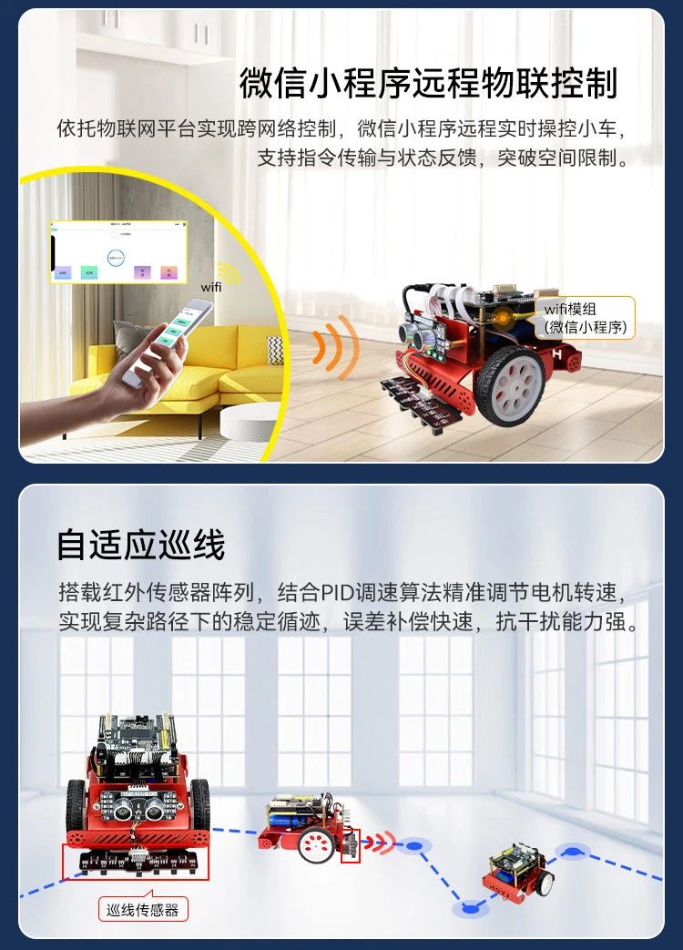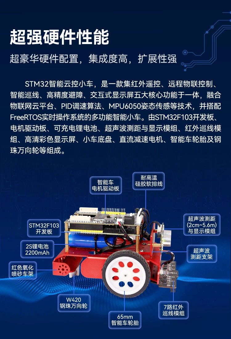 STM32F103智能云控小车是由华清远见倾力打造的一款多功能智能小车,专为高校教学、学生毕业设计、创新竞赛、单片机入门学习及项目实践量身定制。这款小车集红外遥控、远程物联网控制、智能巡线、高精度避障和交互式显示屏五大核心功能于一体,融合了物联网云平台、PID调速算法、MPU6050姿态传感等先进技术,并搭载FreeRTOS实时操作系统,是一款技术含量高、功能强大的综合性开发平台。