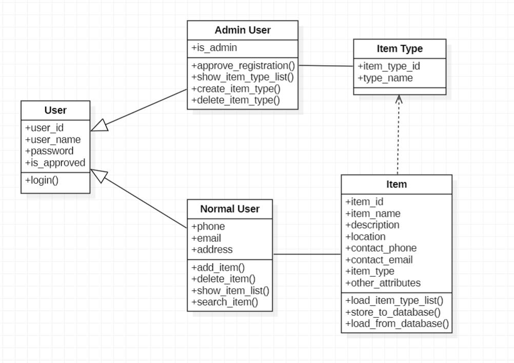 这个应用程序还有两种类型的用户:管理员和普通用户。管理员可以设置新的物品类型,以及修改物品类型。普通用户在添加物品时需要先选择物品类型,然后再填入物品信息。普通用户搜寻物品时,需要先选择类型,再输入关键字,关键字可以在物品名称和说明中进行匹配。此外,普通用户需要先进行注册,填写基本信息,包括住址和联系方式。注册后,普通用户的注册申请需要经过管理员的批准,方能成为正式用户。