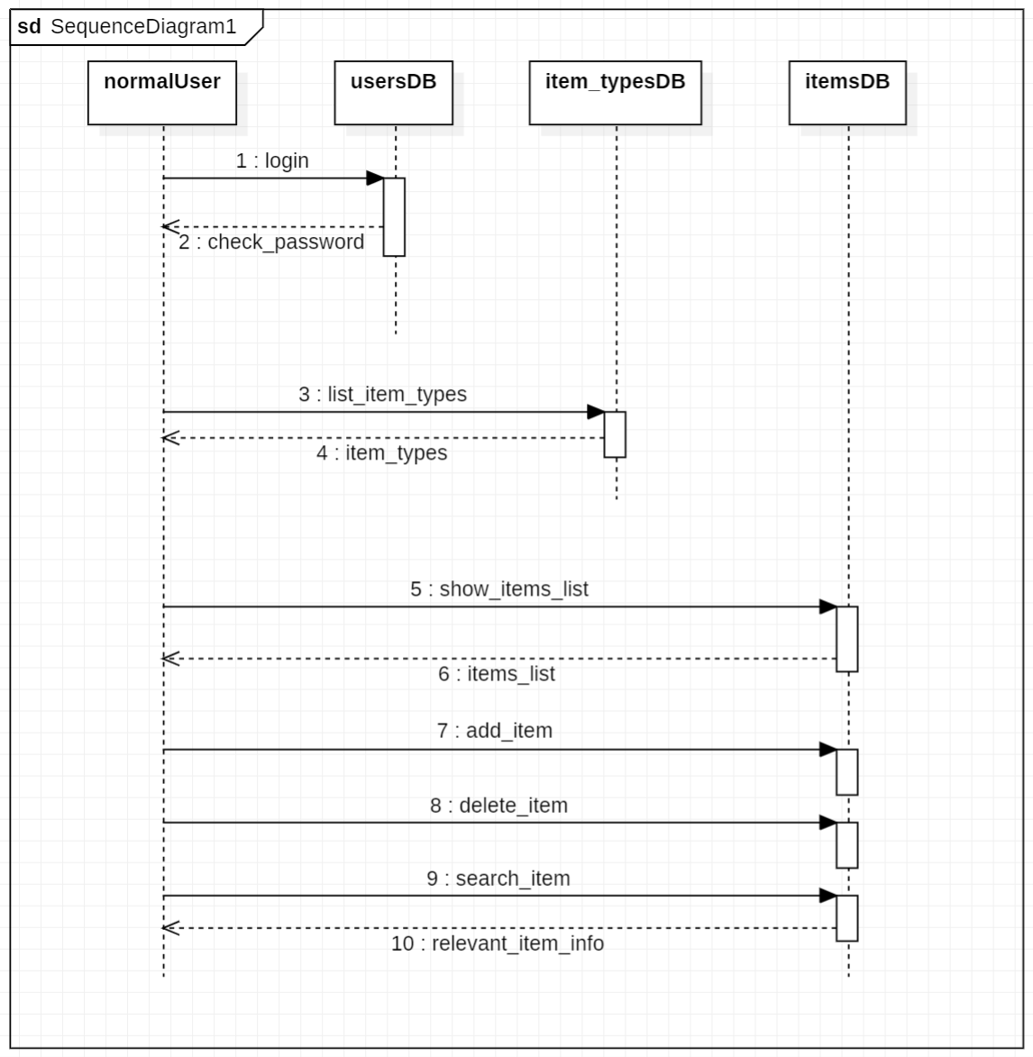 普通用户登录后进入普通用户操作界面,允许用户查看物品信息列表,选择已有的物品类型增添物品信息,删除物品信息,以及根据物品类型和关键字查找物品。