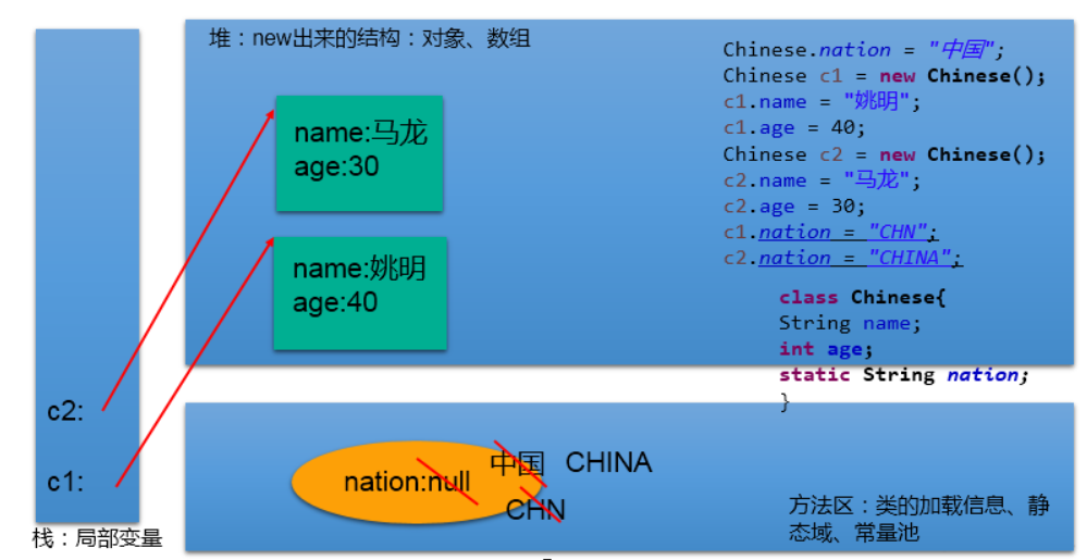 ③ 由于类只会加载一次,则静态变量在内存中也只会存在一份:存在方法去的静态域中