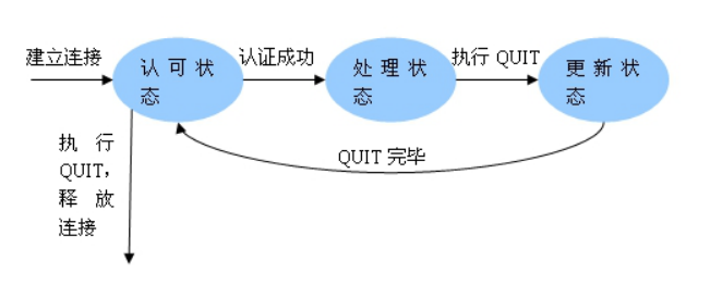 POP3协议有三种状态:认正状态、处理状态和更新状态。客户机与服务器刚与服务器建立连接时,它的状态为认证状态;一旦客户机提供了自己身份并被成功地确认,即由认可状态转入处理状态; 在完成相应的操作后客户机发出QUIT命令,则进入更新状态,更新之后又重返认可状态;当然在认可状态下执行QUIT命令,可释放连接。
