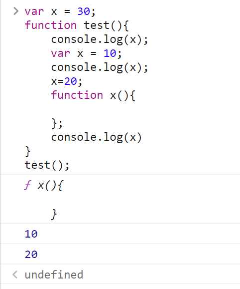 test是函数,每个函数作用域也首先要进行预解析,var,function声明的变量或者函数首先变量提升,但是函数的优先级高于变量,所以预解析池最终结果为function x(){}