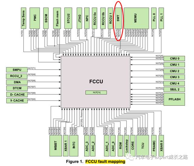 对于以前的MPC56xx系列MCU,SWT的复位请求直接连到(route to) RGM(Reset Generate Module--复位产生模块)直接产生对MCU的硬件复位,而在MPC574xP上,其SWT的溢出事件是作为MCU系统失效连接到FCCU的,通过FCCU的配置决定是否复位MCU: