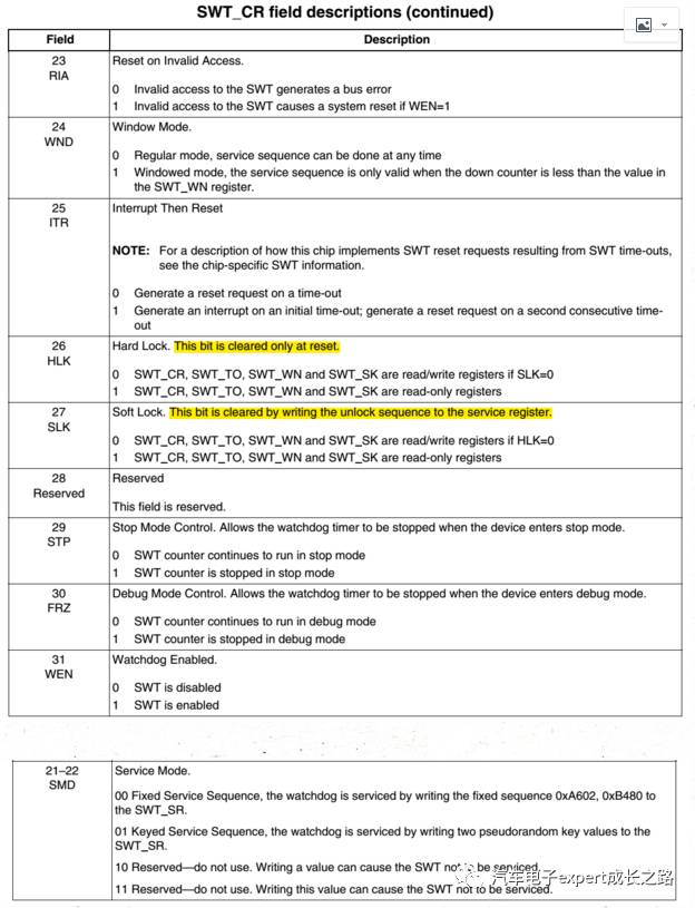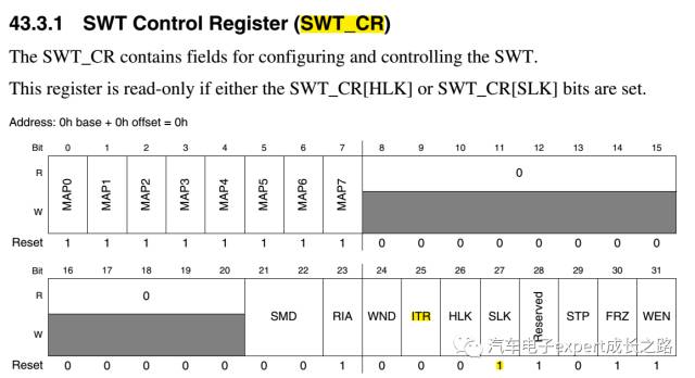 通过SWT的控制寄存器SWT_CR,可知SWT定时器工作有正常模式(WND=0)和窗口模式(WND=1):