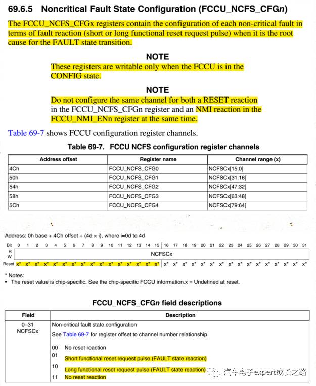 为了保证MPC574xP的SWT正常工作,主要需要配置的FCCU寄存器是FCCU_NCFS_CFGn非关键失效状态配置寄存器,因为其默认NCFSC14 = 00'b,为无复位响应,必须将其配置为对RGM模块产生短功能复位请求脉冲(NCFSC14 = 01'b)或者长功能复位请求脉冲(NCFSC14 = 10'b)