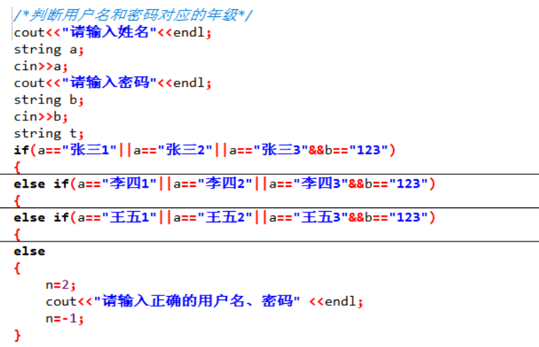命令行输入用户名和密码,两者之间用空格隔开(程序预设小学、初中和高中各三个账号,具体见附表),如果用户名和密码都正确,将根据账户类型显示“当前选择为XX出题”,XX为小学、初中和高中三个选项中的一个。否则提示“请输入正确的用户名、密码”,重新输入用户名、密码;
