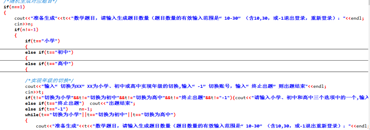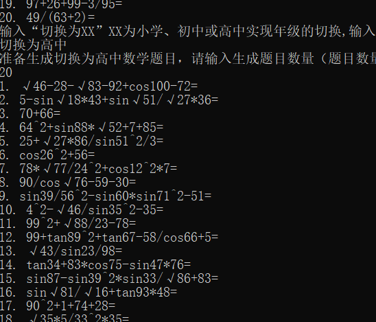 题目数量的有效输入范围是“10-30”(含10,30,或-1退出登录),程序根据输入的题目数量生成符合小学、初中和高中难度的题目的卷子(具体要求见附表)。同一个老师的卷子中的题目不能与以前的已生成的卷子中的题目重复;