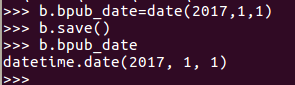 b=BookInfo() b.btitle='abc' b.bpub_date=date(2017,1,1) b.save()