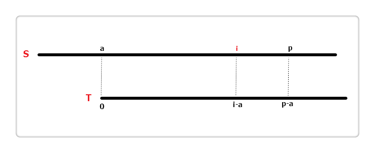 如上图,假设当前遍历到S串位置i,即extend[0]...extend[i - 1]这i个位置的值已经计算得到。设置两个变量,a和p。p代表以a为起始位置的字符匹配成功的最右边界,也就是"p = 最后一个匹配成功位置 + 1"。相较于字符串T得出,S[a...p)等于T[0...p-a)。