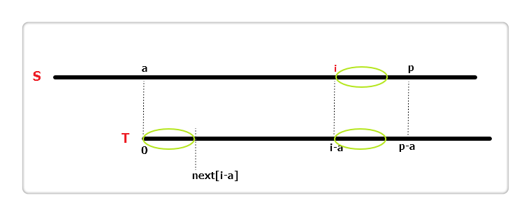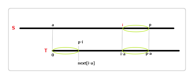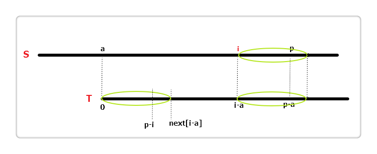 如果i + next[i - a] == p呢?如上图,三个椭圆都是完全相同的,S[p] != T[p - a]且T[p - i] != T[p - a],但S[p]有可能等于T[p - i],所以我们可以直接从S[p]与T[p - i]开始往后匹配,加快了速度。