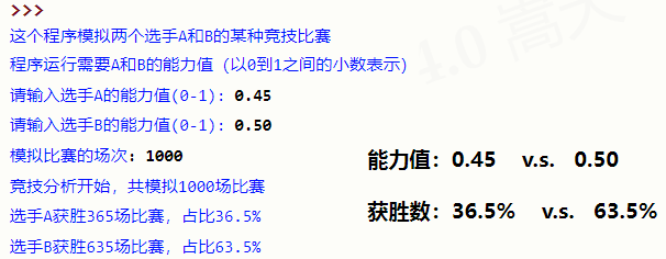 b = eval(input("请输入选手B的能力值(0-1):"))