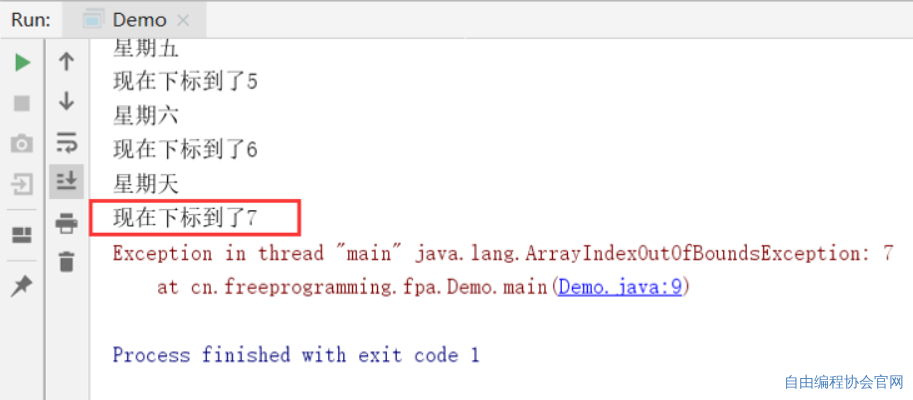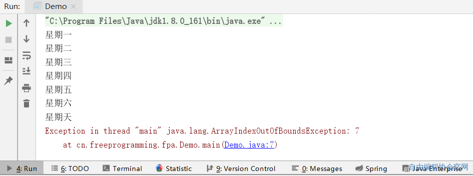 在 at cn.freeprogramming.fpa.Demo类的main方法里的(Demo.java:第7行代码