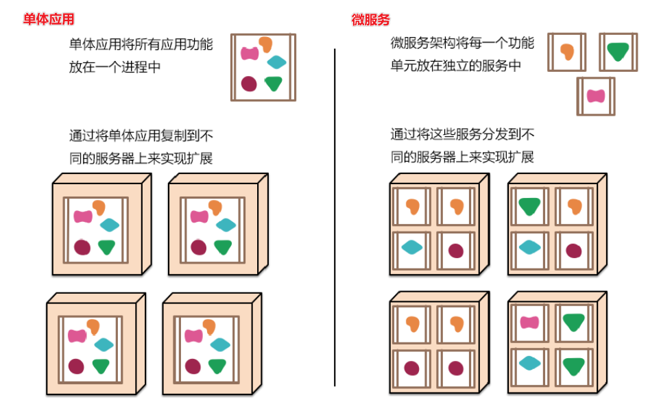 复杂应用被拆分成独立的、职责单一的小型功能模块(微服务)