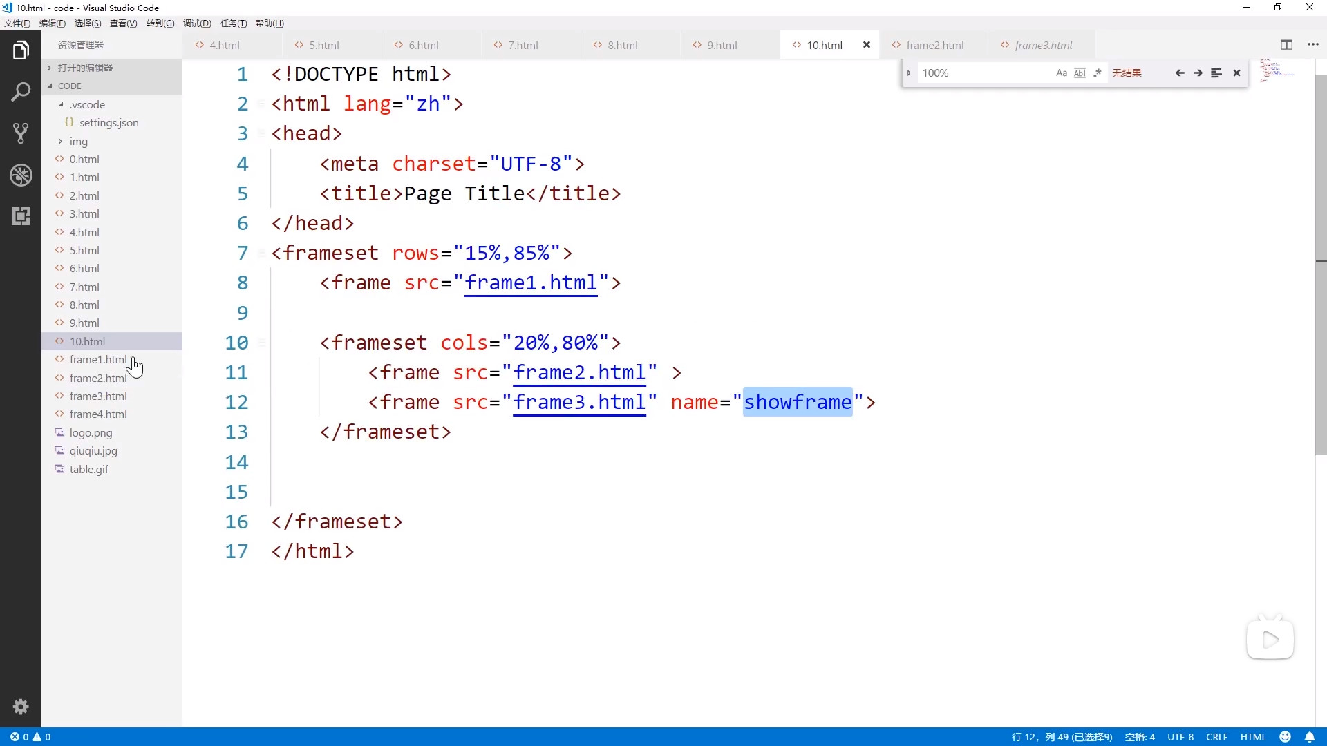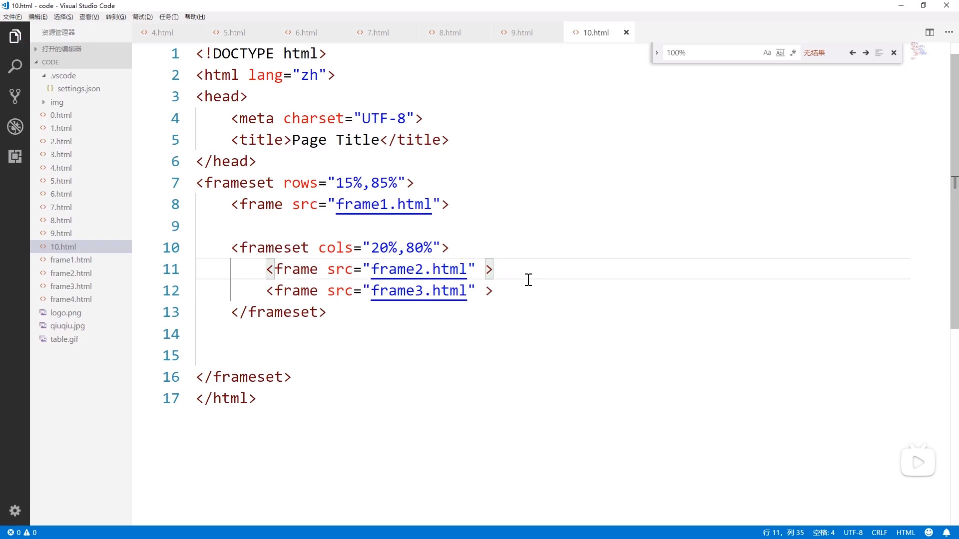 < frameset > 标签与< body > 标签同级,所以< frameset > 标签不能写在< body > 标签内,要单独存在。