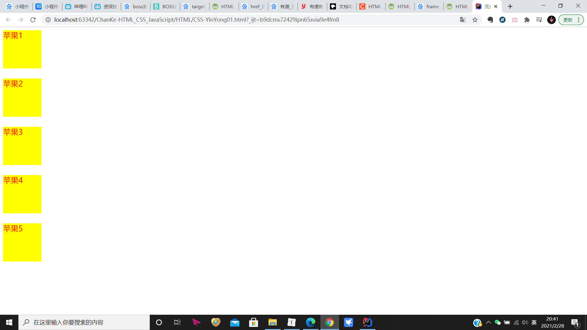 <!DOCTYPE html> <html lang="en"> <head> <meta charset="UTF-8"> <title>元素内嵌样式表</title> </head> <body> <div style="color: red;background: yellow;width: 100px;height: 100px;">苹果1</div> <br> <div style="color: red;background: yellow;width: 100px;height: 100px;">苹果2</div> <br> <div style="color: red;background: yellow;width: 100px;height: 100px;">苹果3</div> <br> <div style="color: red;background: yellow;width: 100px;height: 100px;">苹果4</div> <br> <div style="color: red;background: yellow;width: 100px;height: 100px;">苹果5</div> </body> </html>效果: