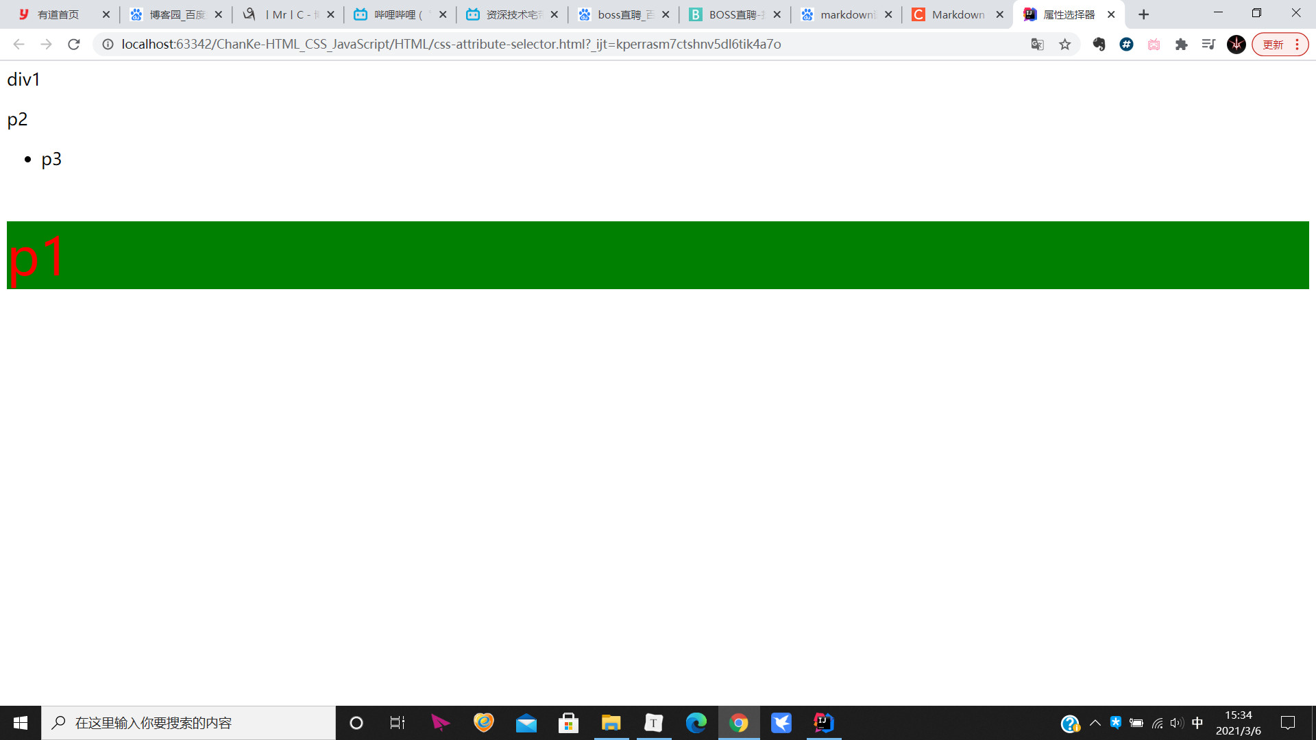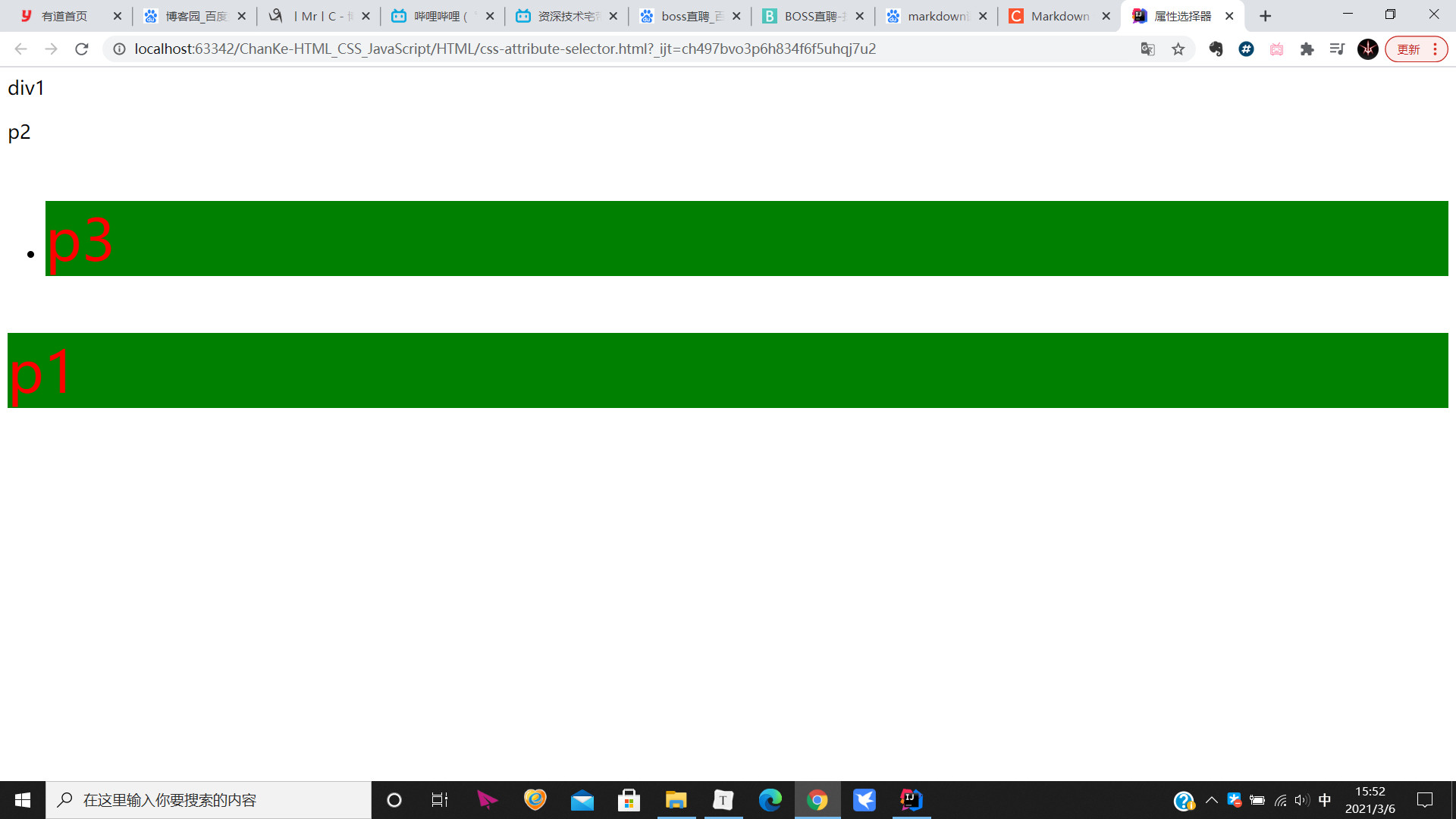 <!DOCTYPE html> <html lang="en"> <head> <meta charset="UTF-8"> <title>属性选择器</title> <link rel="stylesheet" href="css-attribute-selector.css"> </head> <body> <div> div1 <p>p2</p> <ul> <li> <p title="paragraph03 pp">p3</p> </li> </ul> </div> <p title="paragraph01 pp">p1</p> </body> </html>css