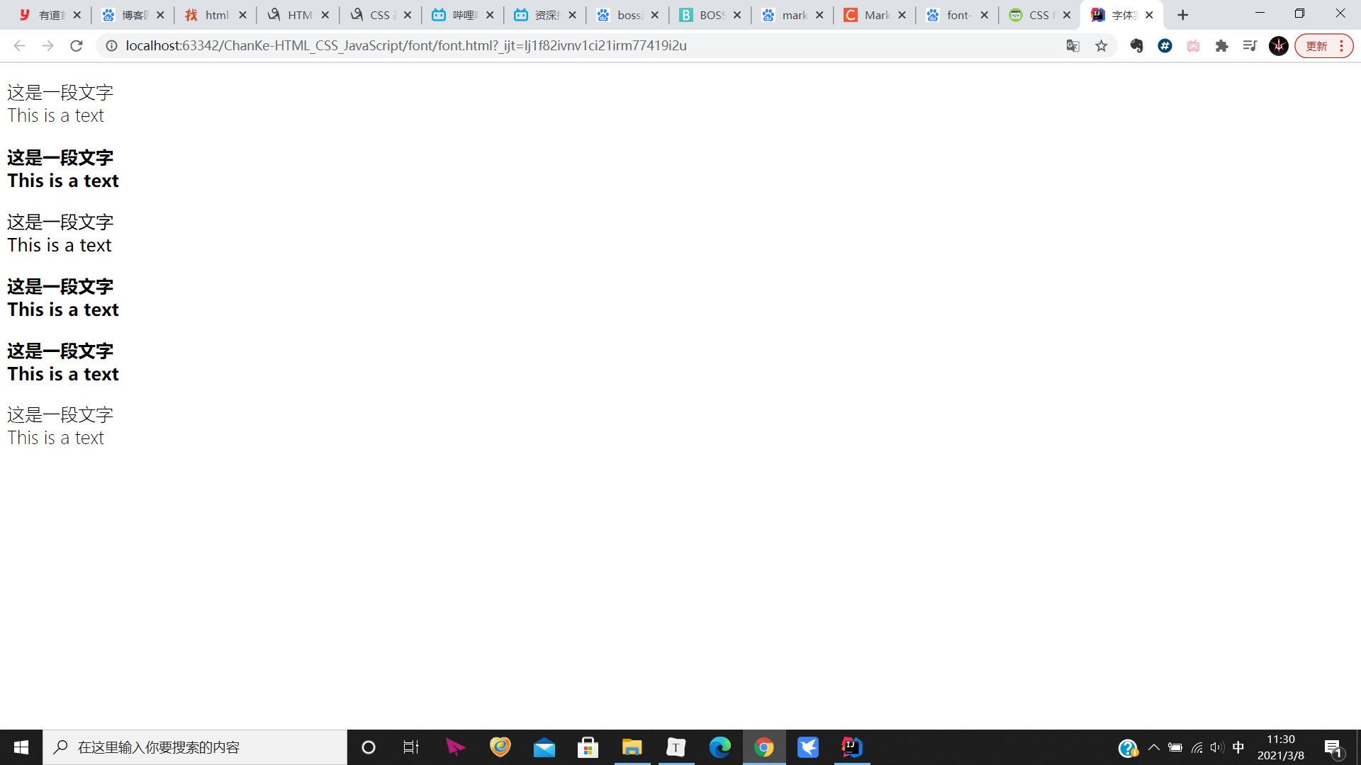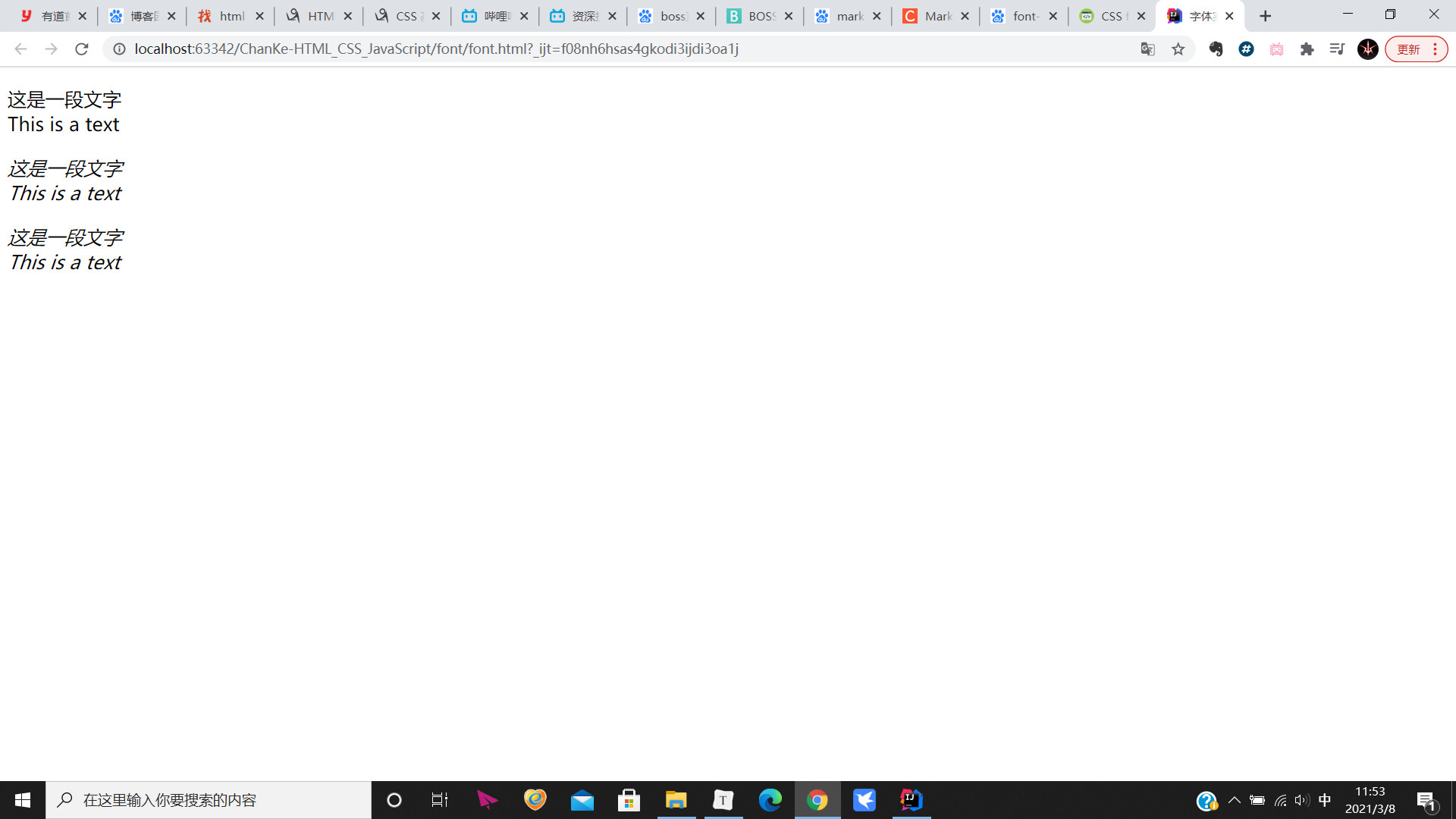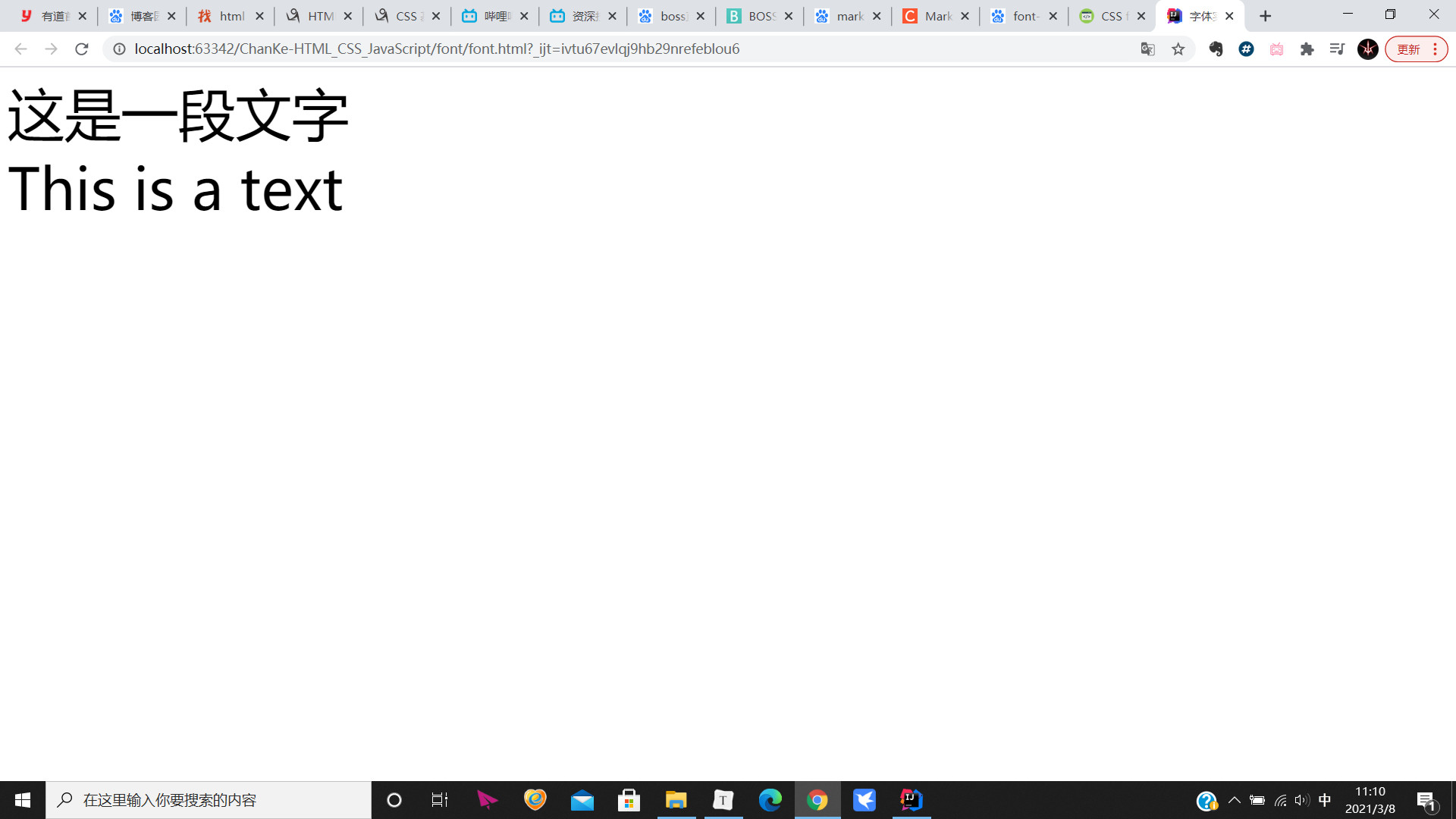 <!DOCTYPE html> <html lang="en"> <head> <meta charset="UTF-8"> <title>字体实例</title> <link rel="stylesheet" href="font.css"> </head> <body> 这是一段文字 <br> This is a text </body> </html>css
