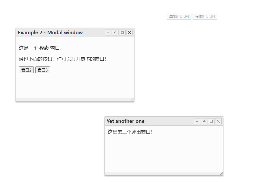 < button id="basic-demo_button" class="btn btn-primary">单窗口示例 < div id="basic-demo" class="example_content">这是一个模态窗口