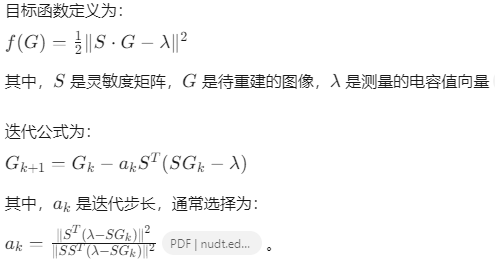 Landweber算法是一种基于最速梯度下降法的迭代算法,广泛应用于电容层析成像(ECT)的图像重建问题中。其基本原理是通过逐步迭代的方式,最小化目标函数,从而重建出图像。