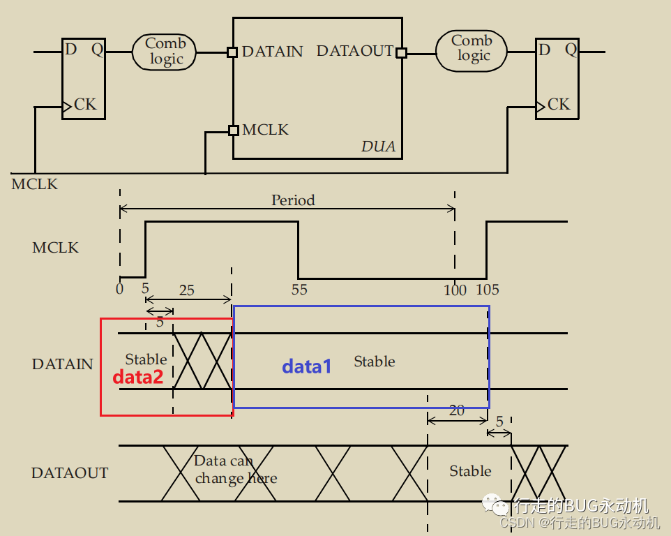 对于DATAIN的波形,红的方框框住的是当前的数据,而蓝色方框框住的是前一次的数据,因此,data2保持稳定的时间最大是25ns,最小是5ns