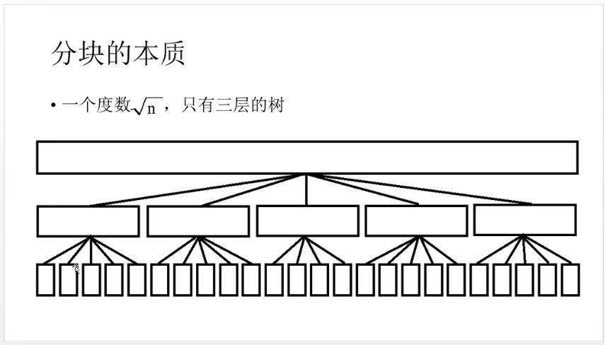 - 基本操作:分块实际上是把区间操作放在了整块【区间被完全包含在块中】以及不完整的块【也就是左右段点所在的块中】