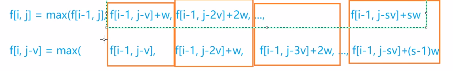 f(i,j)=max(f(i-1,j),f(i,j-v[i]+w[i]):也可以理解成,从上一维的表格从后向前进行枚举,每次枚举取一个,取两个....