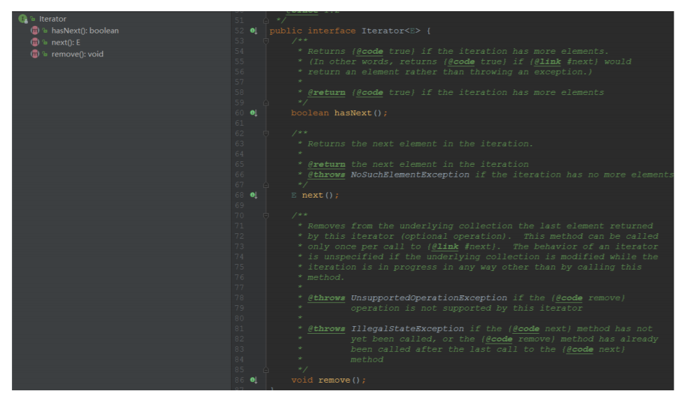 它有iterator()这个⽅法,返回的是Iterator 再来看⼀下,Iterator也是⼀个接⼝,它只有三个⽅法: