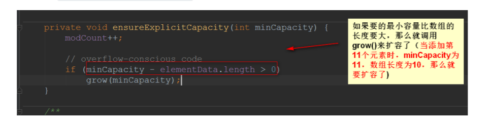 随后调⽤ ensureExplicitCapacity() 来确定明确的容量,我们也来看看这个⽅法是怎么实现的:
