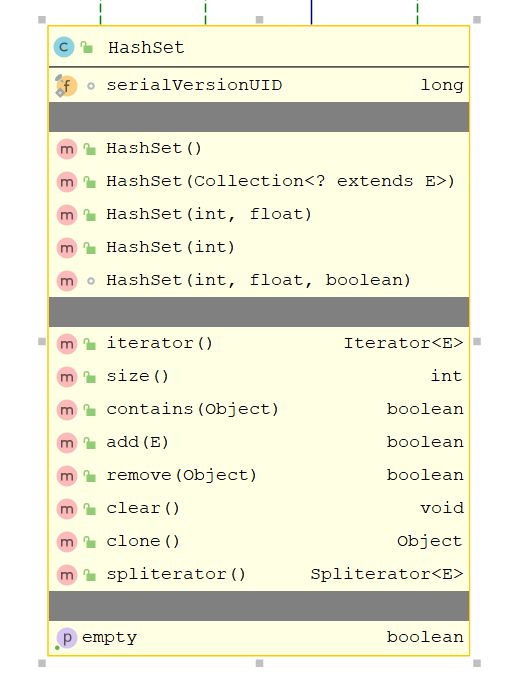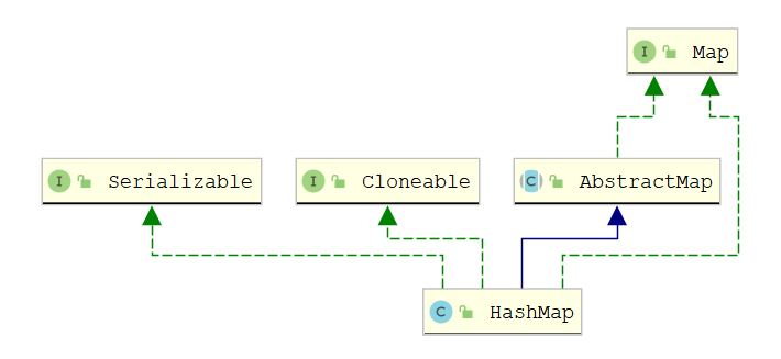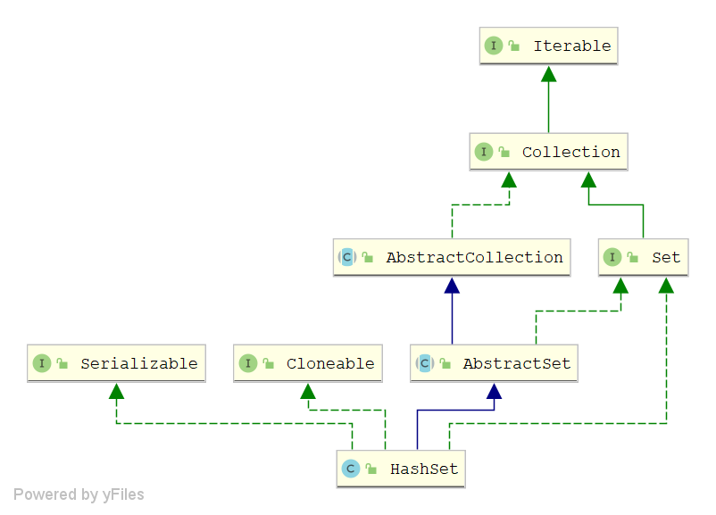 - HashSet<E> extends AbstractSet<E> implements Set<E>, Cloneable, java.io.Serializable