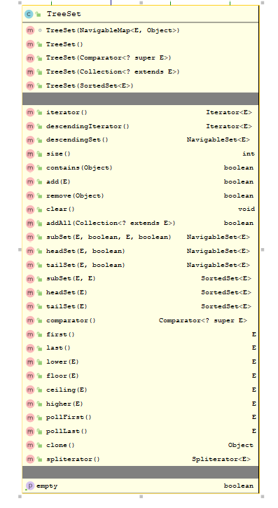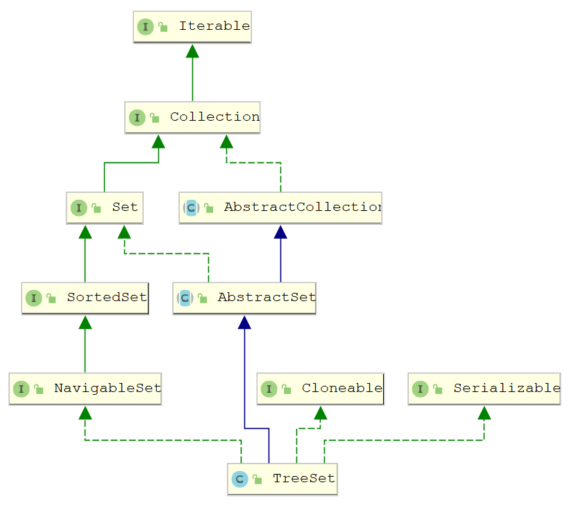 - TreeSet<E> extends AbstractSet<E>implements NavigableSet<E>, Cloneable, java.io.Serializable
