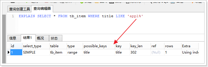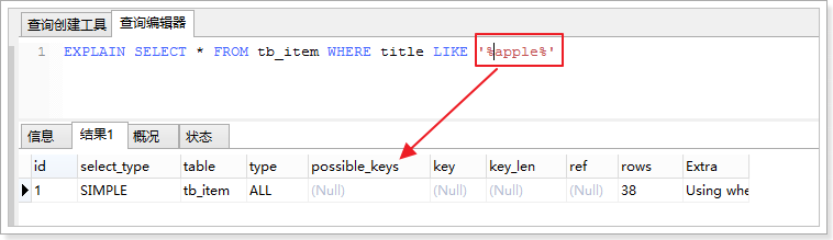- 在使用LIKE关键字进行查询的查询语句中,如果匹配字符串的第一个字符为“%”,索引不起作用。只有“%”不在第一个位置,索引才会生效。