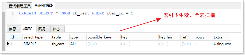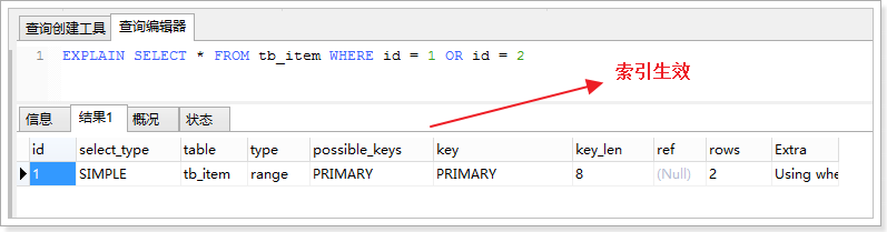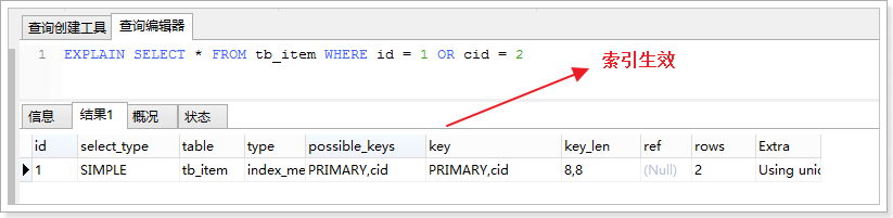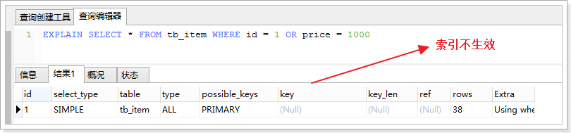 - 查询语句的查询条件中只有OR关键字,且OR前后的两个条件中的列都是索引时,索引才会生效,否则,索引不生效。