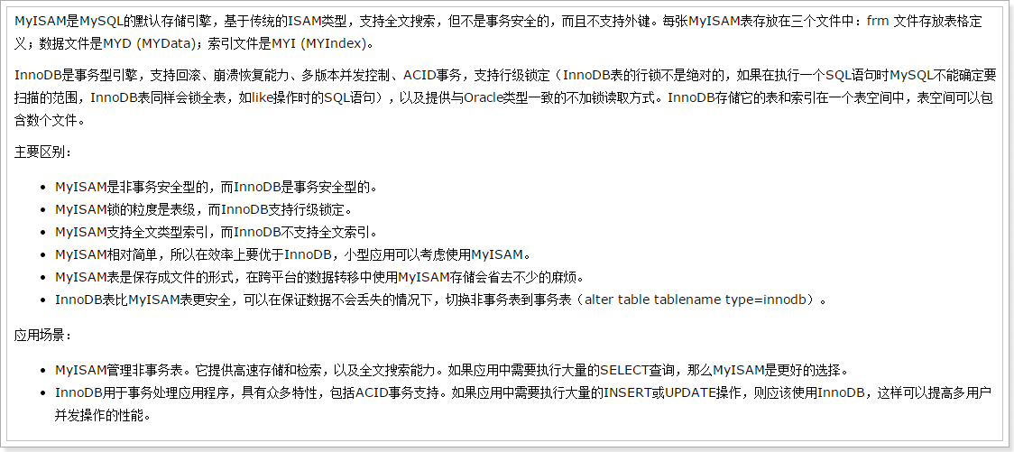 插入数据时,影响插入速度的主要是索引、唯一性校验、一次插入的数据条数等。插入数据的优化,不同的存储引擎优化手段不一样,在MySQL中常用的存储引擎有,MyISAM和InnoDB,两者的区别: