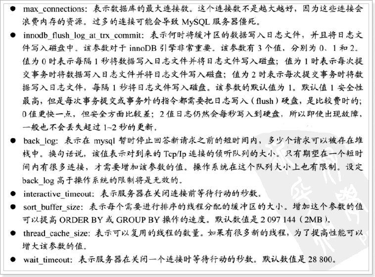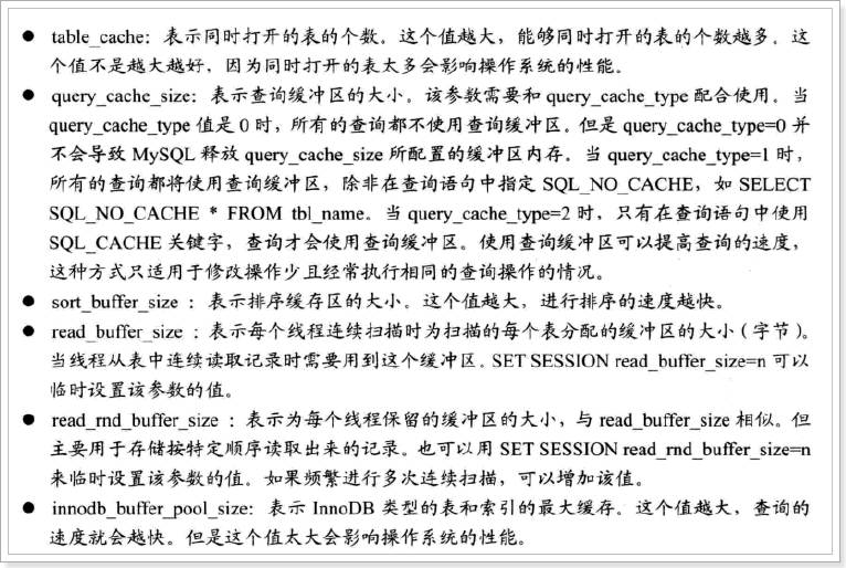 - 合理安排资源、调整系统参数使MySQL运行更快、更节省资源。