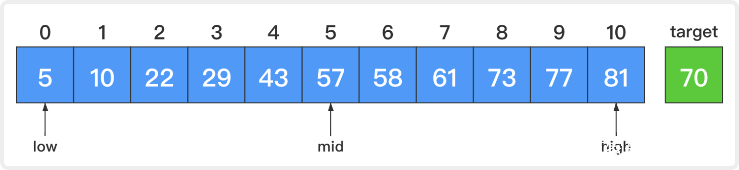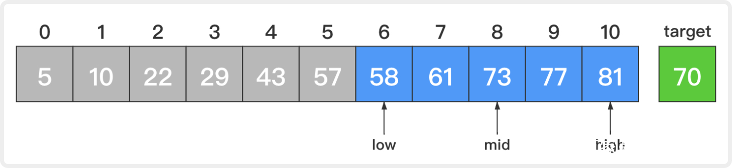 假设原始序列为array=[5, 10, 22, 29, 43, 57, 58, 61, 73, 77, 81],目标元素target=70。