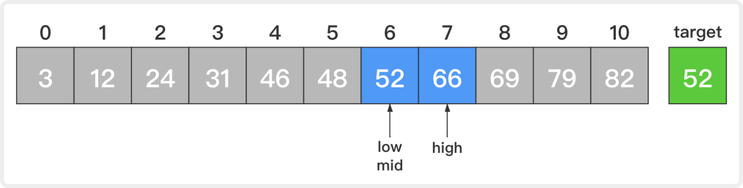 假设原始序列为array=[3, 12, 24, 31, 46, 48, 52, 66, 69, 79, 82],目标元素target=52。