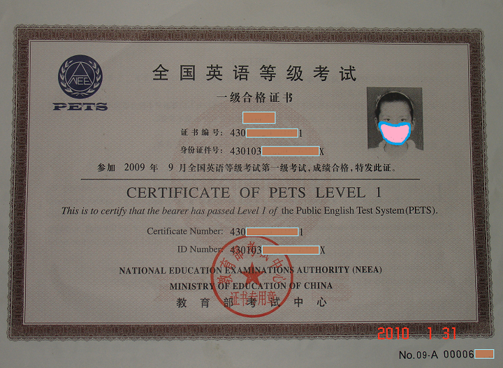 2009年9月12日,在湖南师范大学参加 PETS公共英语考试一级 考试,顺利通过!