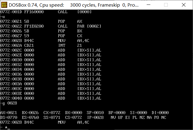 - 给出分析、调试、验证后,寄存器(ax) = ? (bx) = ? (cx) = ? 附上调试结果界面截图。
