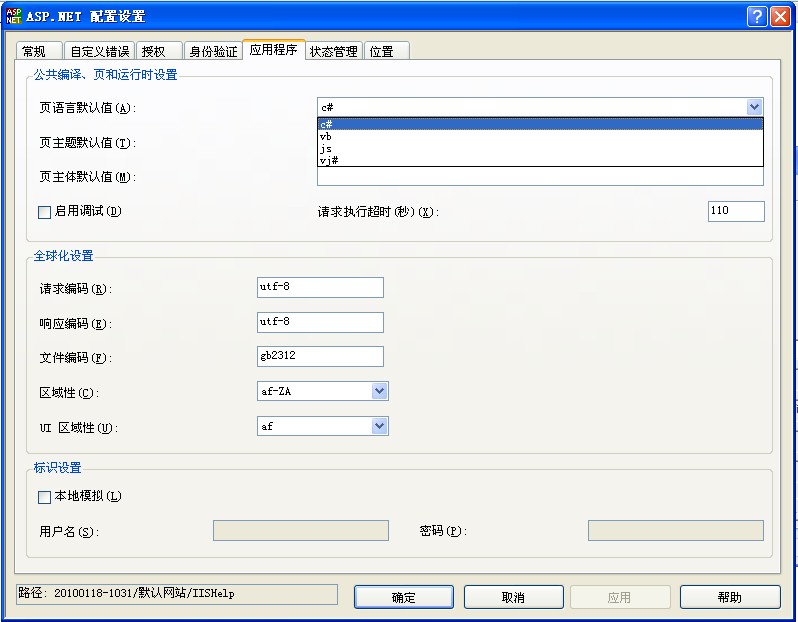 具体如下: 虚拟目录-属性-ASP.NET选项卡-编辑配置-应用程序-页面语言默认值-C#(根据你自己.NET语言自由配置.)