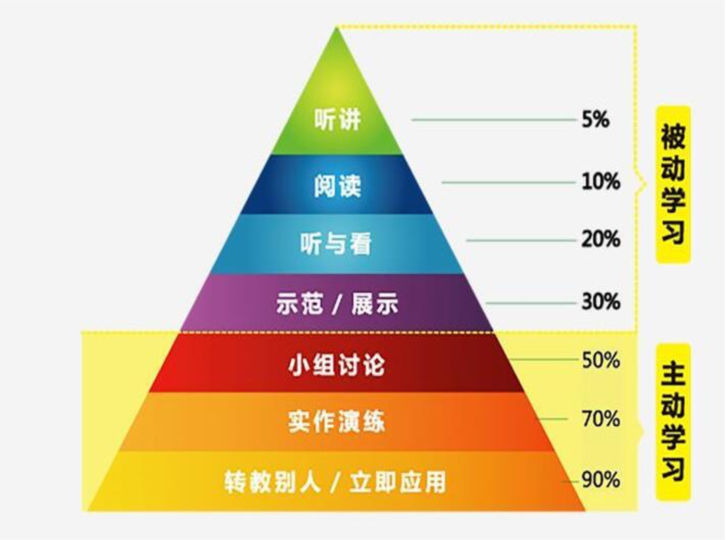 美国国家训练实验室的研究成果显示不同的学习方式产生的学习效果是迥异的,主动学习方式更有助于学习者有效地掌握学习内容,达到事半功倍的效果,其中教别人(知识留存率90%)、实践(90%)、模拟演练(70%)、小组讨论 (50%)这四种学习方式的效果最好,如上图金字塔所示。