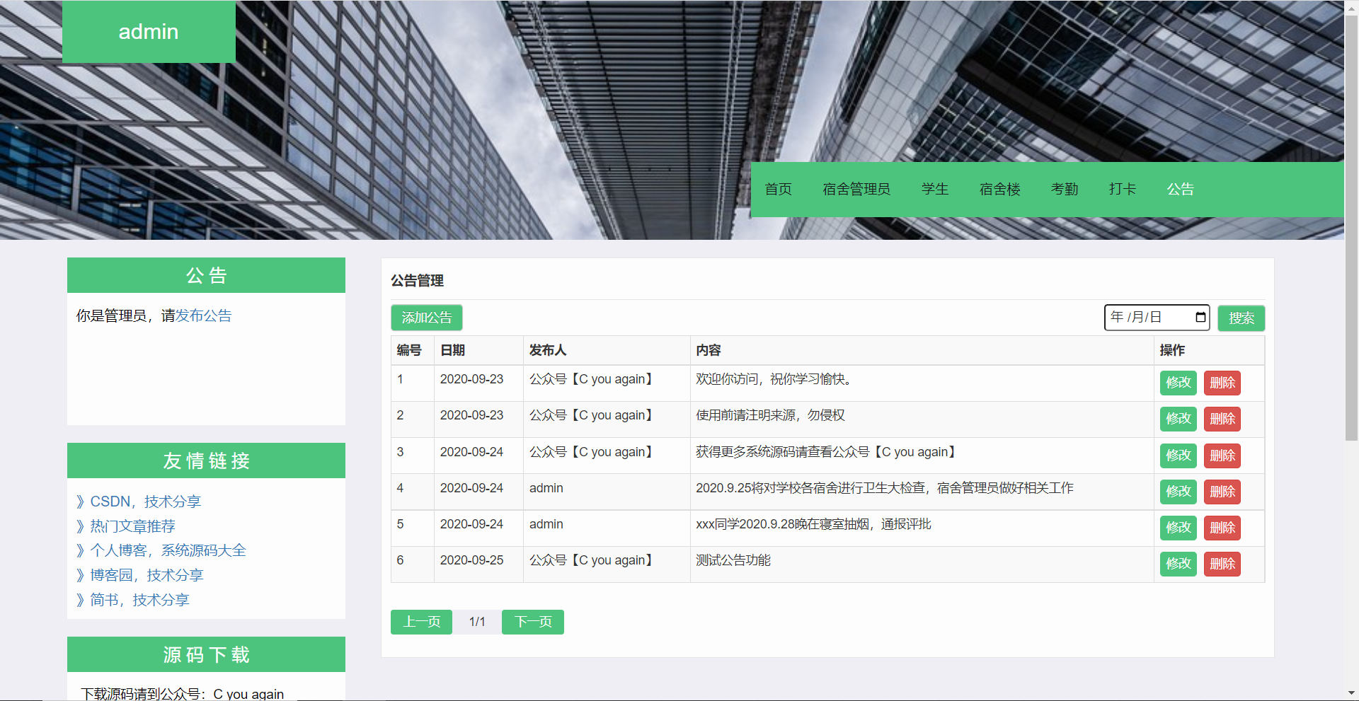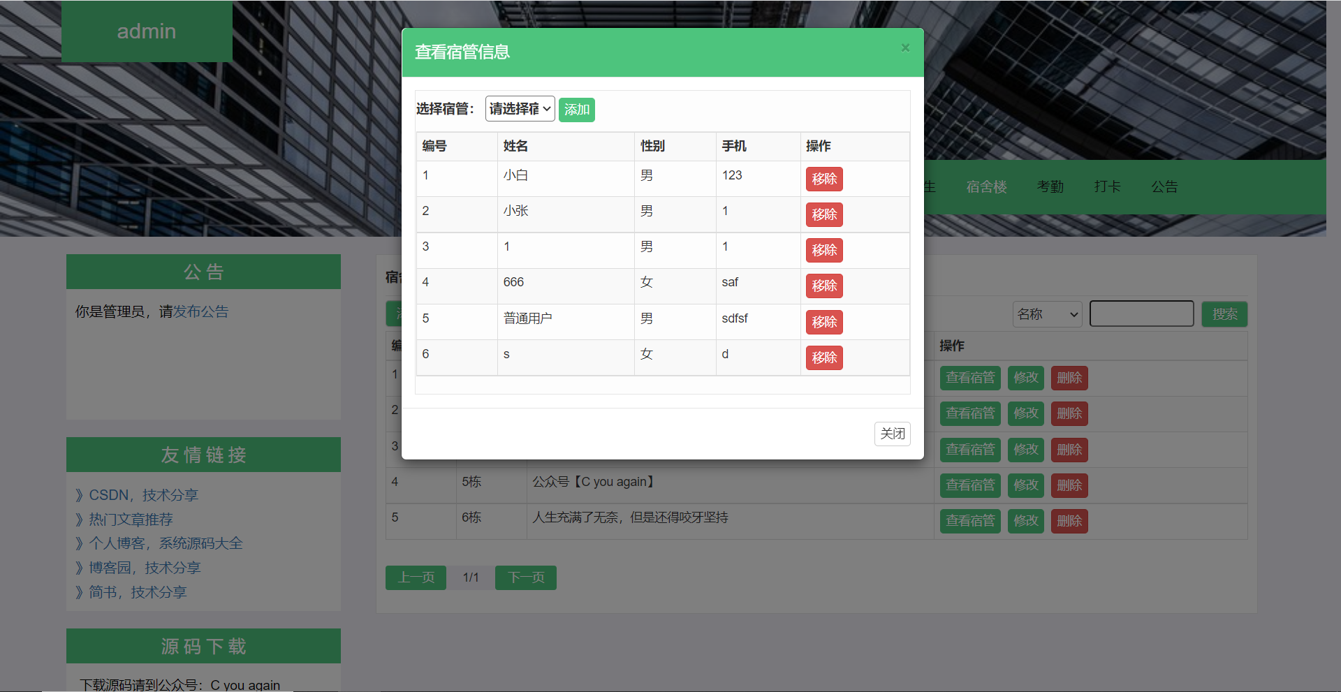 - 宿舍楼管理:添加、修改、删除宿舍楼信息,包括宿舍楼名称、位置等。