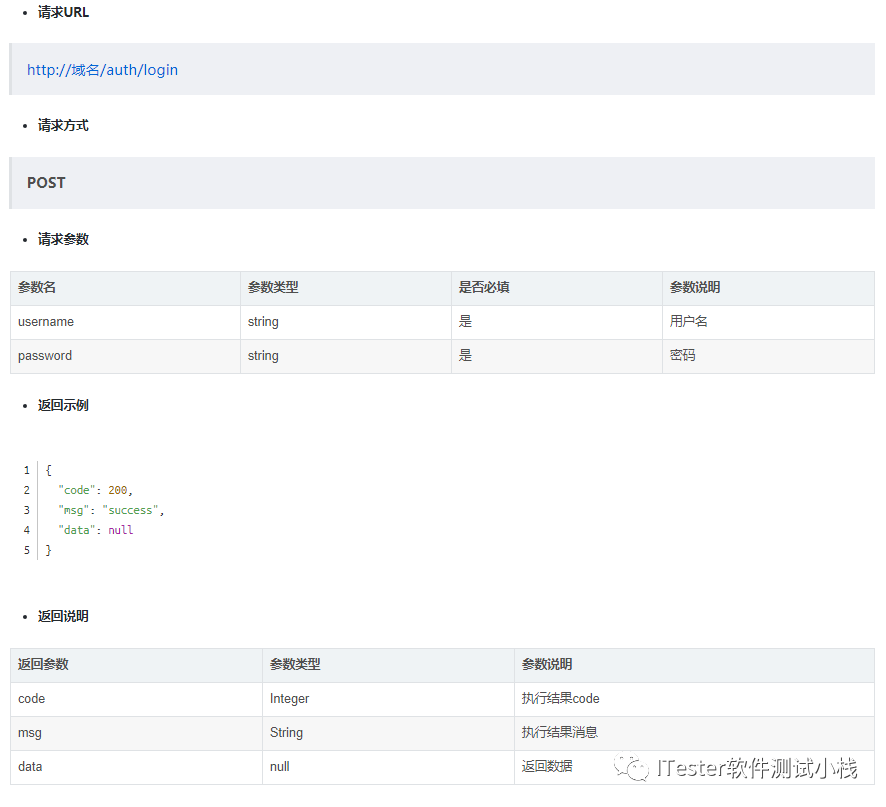 接口文档是我们测试时最重要的一个依据,一个规范的接口文档至少包括: