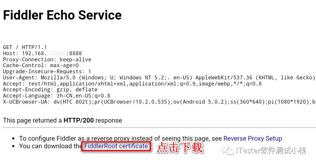 5.手机设置证书:在手机浏览器上输入:http://电脑ip:端口(例如:http://192.168.11.29:8888),页面点击【FiddlerRoot certificate】下载安装Fiddler证书